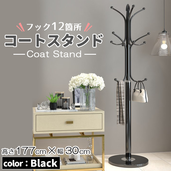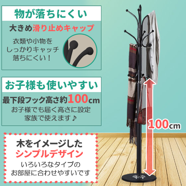 ●フック12カ所カバンや帽子、コートなど1カ所にまとめることが出来ます。●2種類の形状のフック○コートなどの衣類や、帽子○カバン、バッグなど『使い分けることができます』●全体の耐荷重は約40キロポール太さ(約):上部(細い方)3.2cm下部(太い方)5cm●1番低いフックの高さは(約)100cmお子様でも届く高さに設定しました。●ベース直径:約30cm○安物にありがちな安定しない。○ちょっとコートなどを掛けるとグラグラする。そんな問題を解決しました。ストレスフリーでしっかり安定します。●物が落ちにくい大きめの滑り止めキャップで落ちにくい。■木をイメージしたシンプルなデザインです。隅っこから場を華やかにしてくれるはずです。【商品詳細】サイズ(約):高さ177cm 幅30cm ベース直径30cm重量(約):3.5kgベース直径(約):30cm耐荷重(約):40KGカラー:ブラック、ホワイト