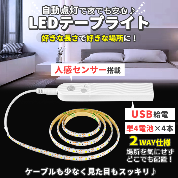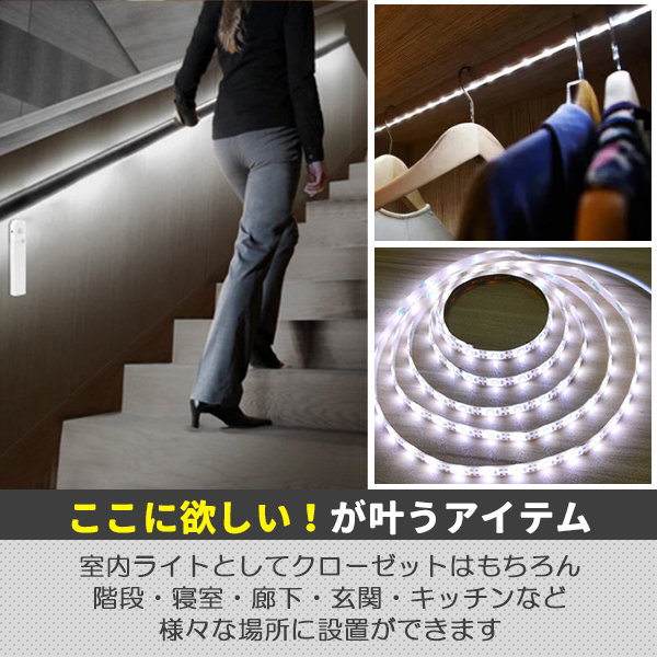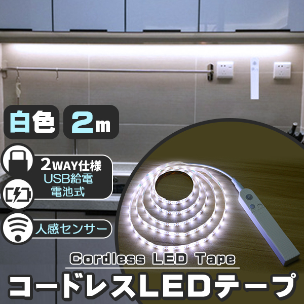 LED テープライト 人感センサー付き 2m 白色 昼光色 USB式 電池式 充電不要 LEDテープ 階段 間接照明 棚下照明 フロアライト 足元灯 人感センサー
