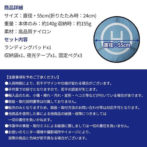 オレンジ/ブルーのリバーシブル!両面使用可能なランディングパッドが登場!!草地や荒れた地面等でランディングさせる時は地面のホコリや砂などを巻き込んでしまいます。このランディングパッドを使用する事で、地面の影響を受けることなく、クリーンな状態で離着陸できます。モーターに吸い込ませたくない砂や埃からドローン守り、草やゴミなどの巻き込みも防げます。専用の収納ケースが付属しており、コンパクトに収納が可能、持ち運びも便利です。【リバーシブル】オレンジとブルーのリバーシブル!高品質のナイロン素材、耐摩耗性に優れています。【簡単収納】簡単に折りたたみができ、コンパクトに収納可能。専用の収納ケース付きで持ち運びも便利。【固定&夜間使用可能】3箇所の位置固定ペグでランディングパッドを固定でき、風の強い日にも使用が可能。反射シールをランディングパッドに貼れば、夜間でもパッドの位置が分かります。【折りたたみ方法】1.ランディングパッドの端と端を持ち、内側に捻ります。2.そのまま折り畳むようにして重ねます。3.収納袋に収まる程度に形を整え、収納してください。