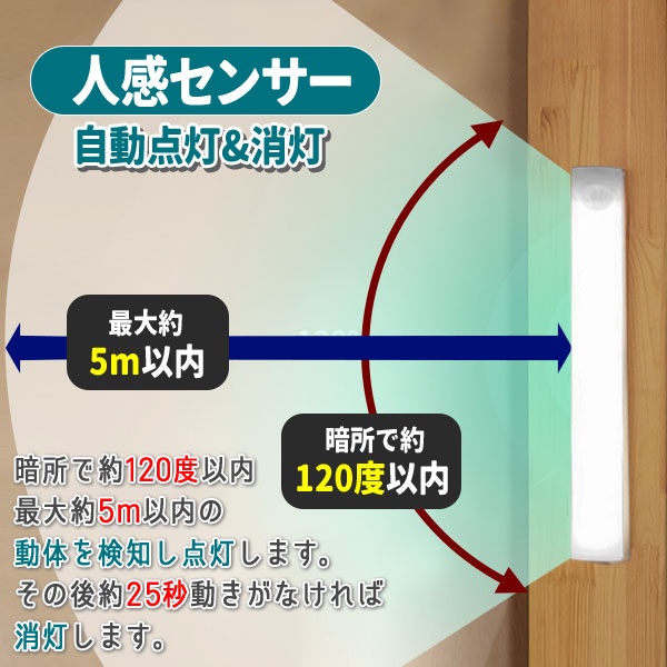 暗所で約120度以内、最大約5m以内の動体を検知し点灯します。
