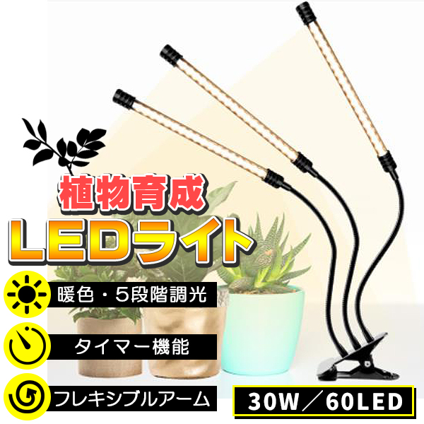 植物ライト LED 植物育成ライト 3灯 植物育成用ledライト クリップ式 30W 60LED 栽培 成長 LEDライト フルスペクトルライト 室内栽培ランプ 5段階調光