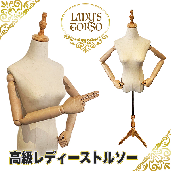 トルソー マネキン レディース 腕付き 9号 麻 木目調 可動式 パンツ対応 アーム付きトルソー 木製3本脚 腕付きトルソー 女性 撮影 アパレル ディスプレイ