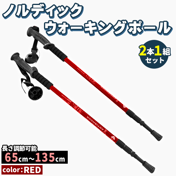 トレッキングポール 2本セット ウォーキングステッキ 伸縮 軽量 アンチショック アルミ ステッキ 杖 ノルディック ウォーキング 登山 キャンプ レッド 赤