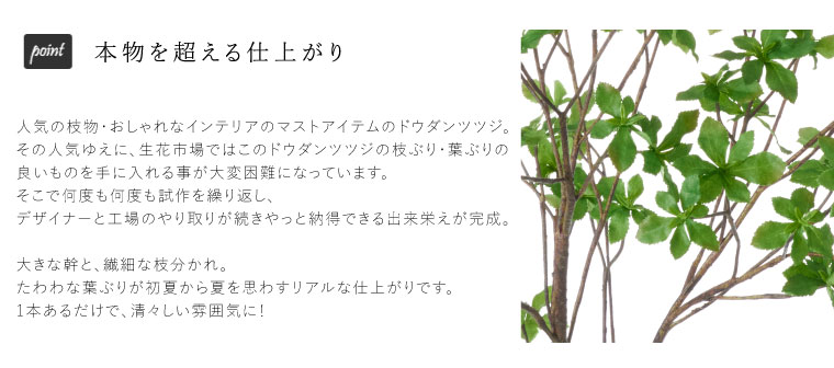 生花のドウダンツツジは乾燥にとても弱く、葉の先がチリチリと枯れたようになってまったり、切り枝が水につかってヌルヌルしてしまったりすることも。フェイクグリーンならそんな難しいお手入れは不要。美しい状態をキープして、長く飾っていただけます。