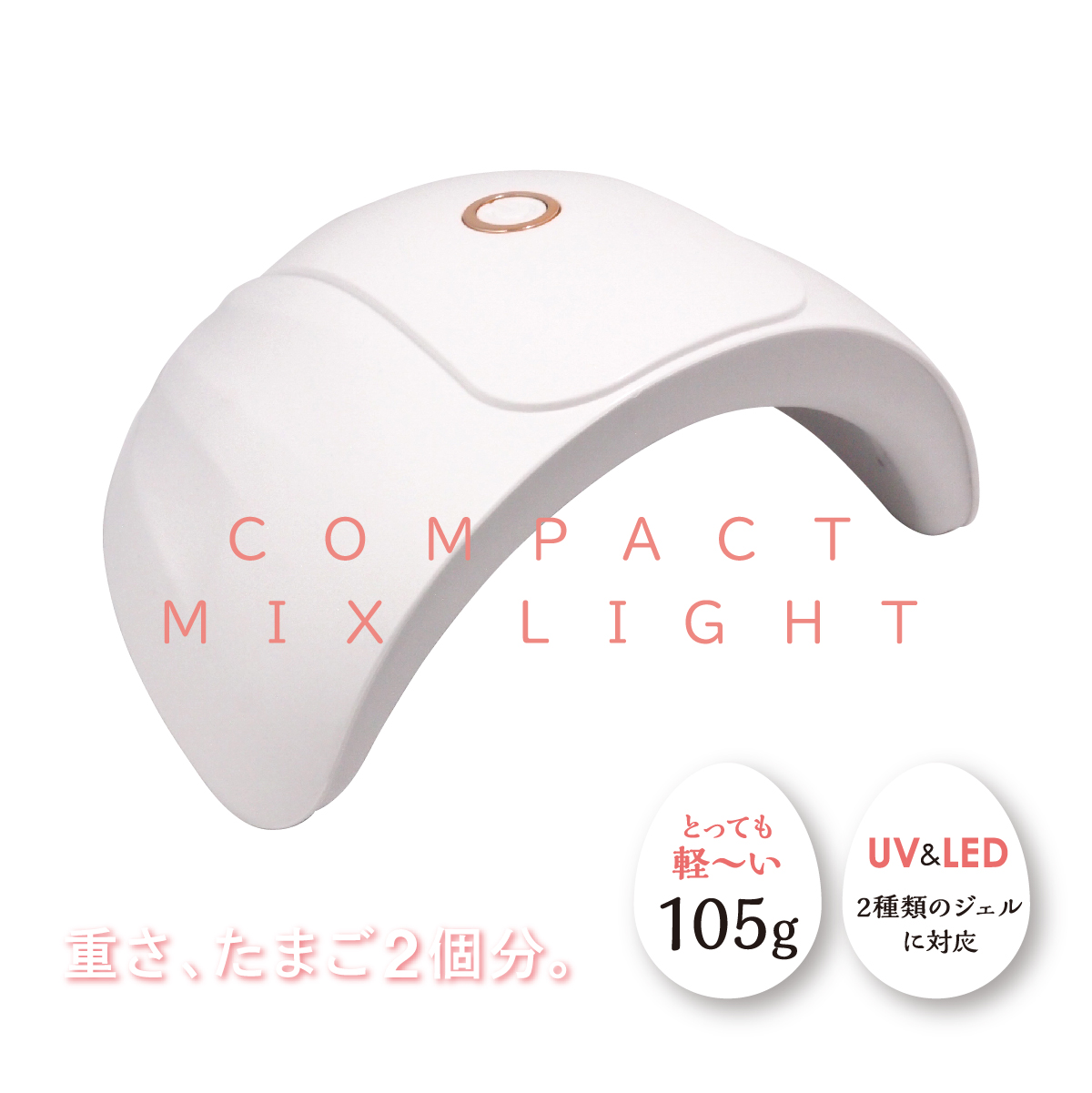 商品説明重さ、たまご2個分。とっても軽〜い105g・UV&LED、2種類のジェルに対応(対応波長365&405nm)・スタートボタンをワンプッシュで60秒点灯し、もう一度押すと消灯します。長押しで120秒照射にも対応。・ライト寿命は約50,000時間・安心の1年間保証です。■ご使用方法本製品にはUSB電源アダプターが必要です。5V/2.0A以上のUSB電源をお使いください。パソコンのUSBや5W(5V/1A)程度のUSB充電器など、低出力のUSBでは十分な硬化ができない場合がございます。商品内容コンパクトMIXライト本体 1台取扱説明書(保証書)1枚仕様・電圧 AC100~240V 50/60Hz入力電圧 電流5V/2.0A消費電力 最大24W60・120秒自動消灯波長 365&405nm(ナノメートル)±5nm材質 ABS樹脂、PP