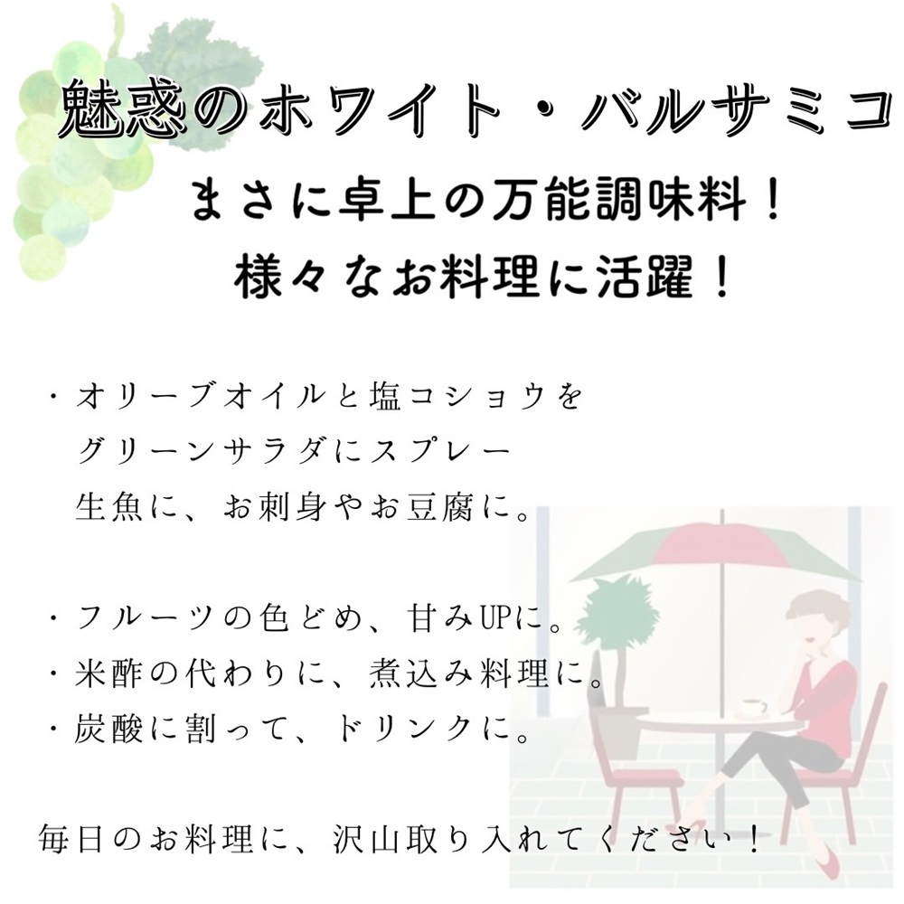 【商品情報】使いやすくてコスパの良い、人気の白バルサミコです。こちらの白バルサミコは非常にしっかりした甘みと、モデナのホワイトバルサミコ酢特有の酸味のバランスが良く、サラダにかけても最高です。ぜひオリーブオイルと一緒に使ってみてください!お料理に色を付けたくない場合などにも、大変便利です。