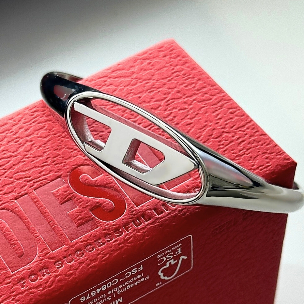 【 存在感あるロゴカットアウト|シルバーステンレスのDIESELメンズバングル 】