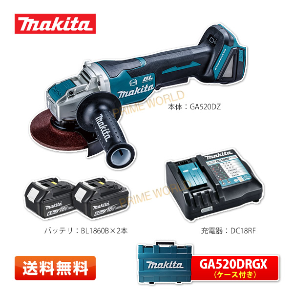 マキタ GA520DRGX 充電式ディスクグラインダ 18V(6.0Ah×2本) 純正バッテリBL1860B×2本/充電器DC18RF/ケース付