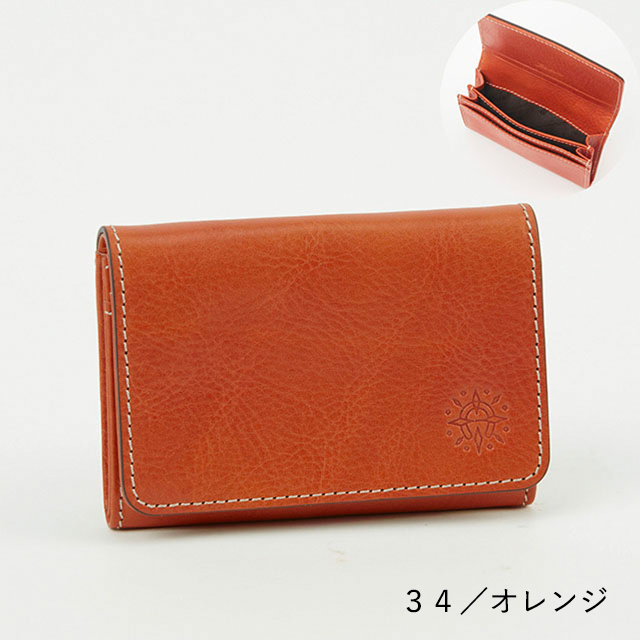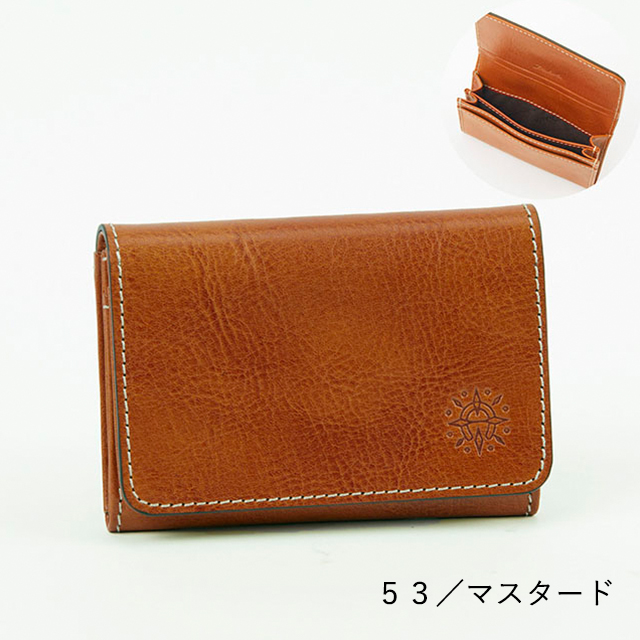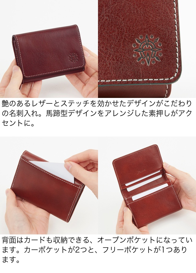 ビジネスシーンで使いやすい、シンプルなデザインの名刺入れ。開くとカードポケットが2つ、フリーポケットが1つ付いています。中は2つに仕切られており、名刺の整理がしやすい仕様に。背面オープンポケットも付いているので、頂いた名刺を入れておくのにも役立ちます。