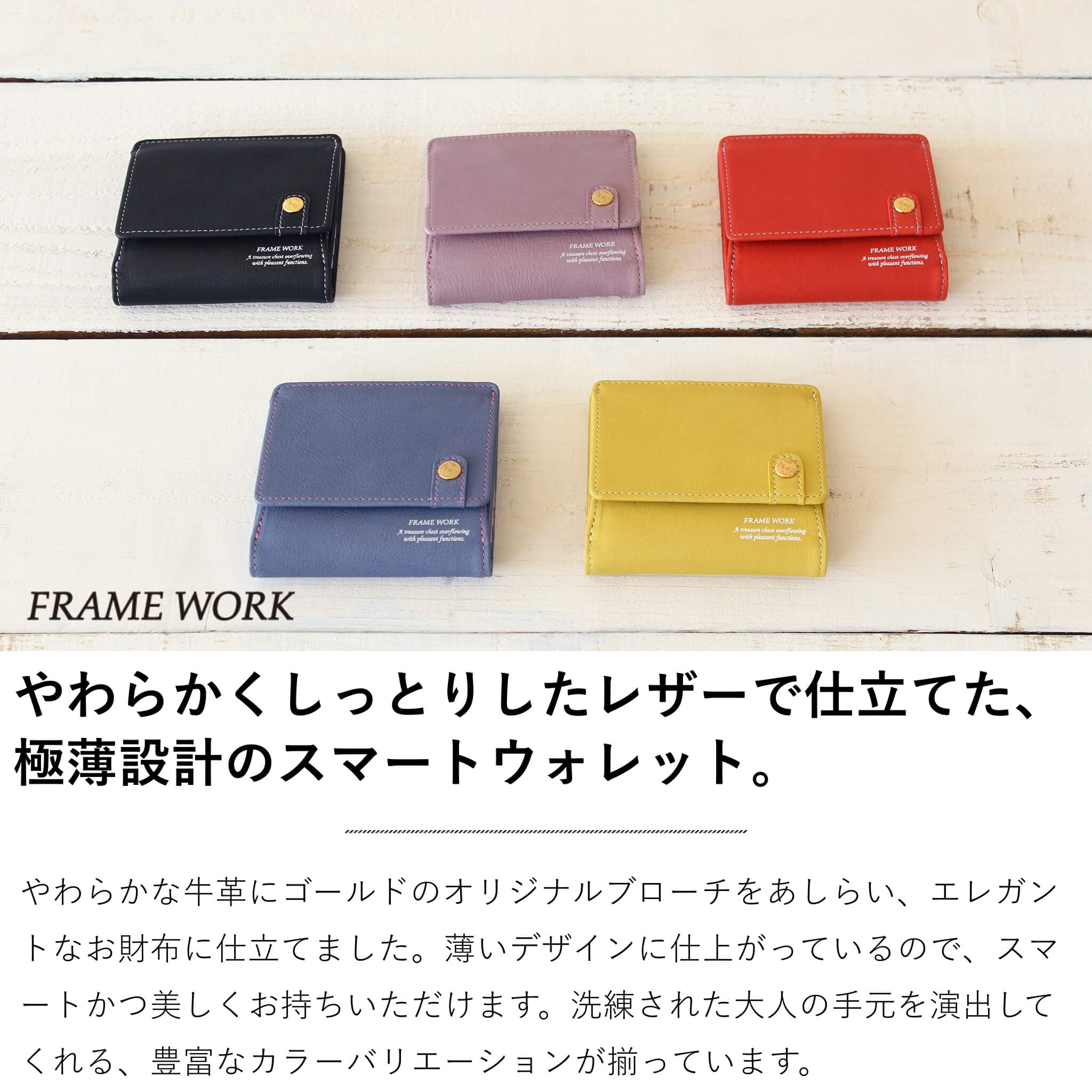 やわらかな牛革にゴールドのオリジナルブローチをあしらい、エレガントなお財布に仕立てました。薄いデザインに仕上がっているので、スマートかつ美しくお持ちいただけます。洗練された大人の手元を演出してくれる、豊富なカラーバリエーションが揃っています。