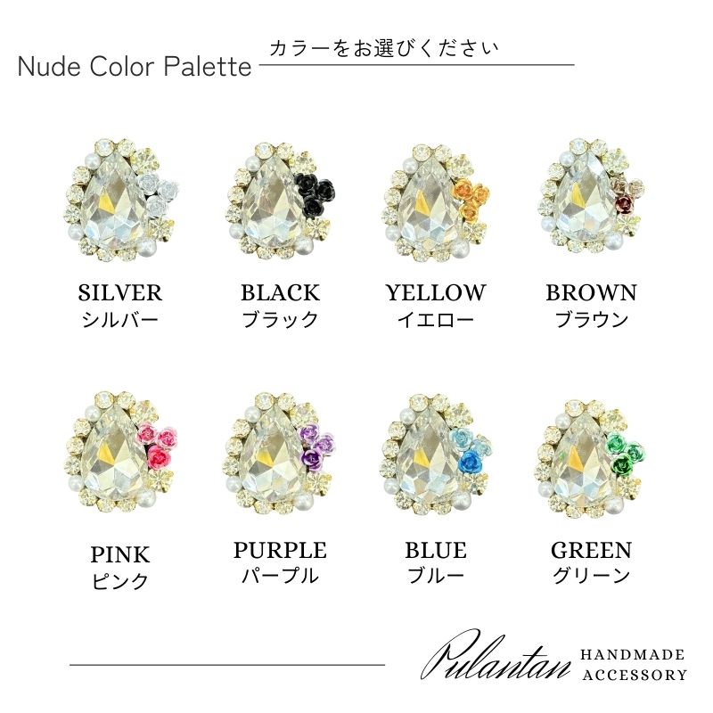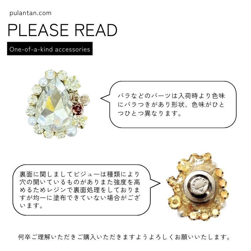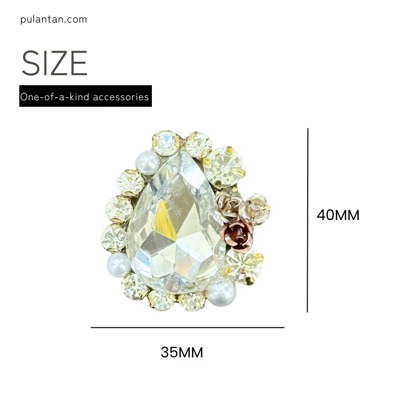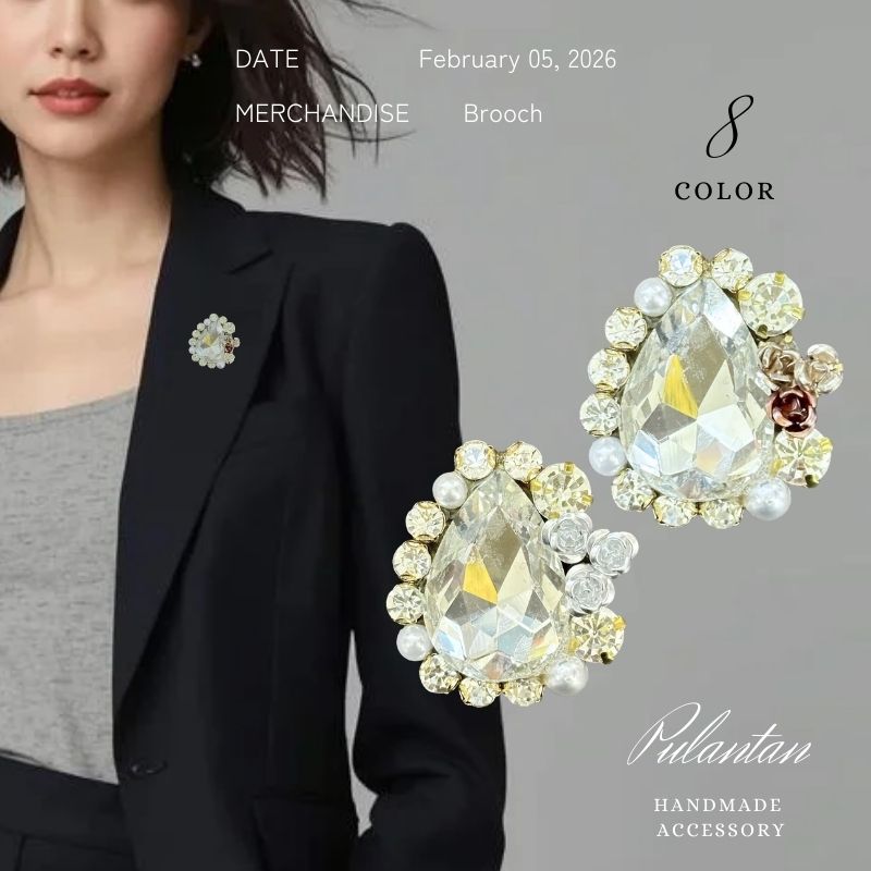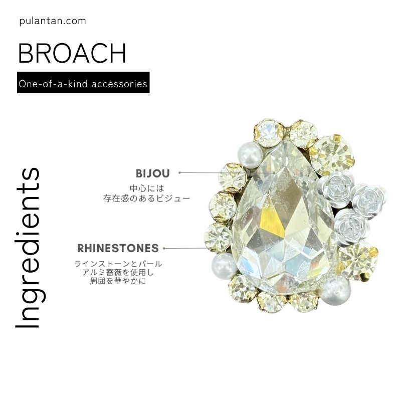 A級ガラスビジューとワンポイントにバラを入れた上品なブローチ。どこにもないプランタンオリジナルのブローチだから被ることなくこれひとつで胸元が華やかになり目を惹くアイテム。