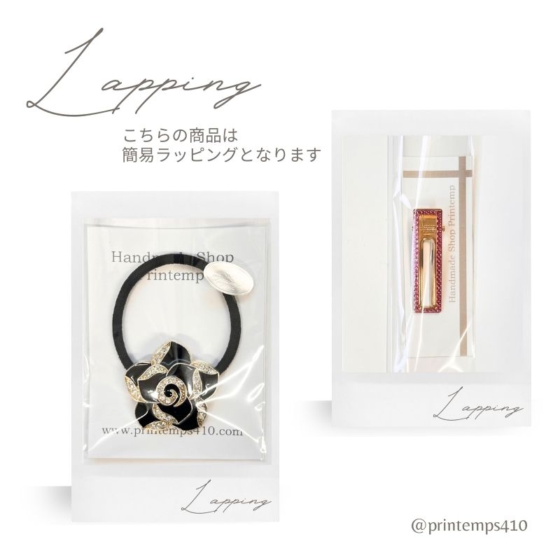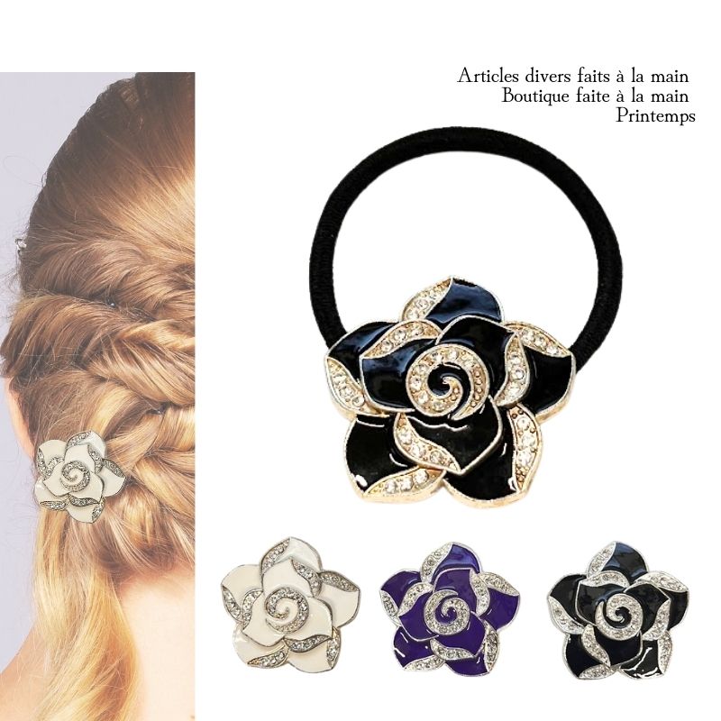 ラインストーンが散りばめられたカメリアパーツで髪ゴムを製作。