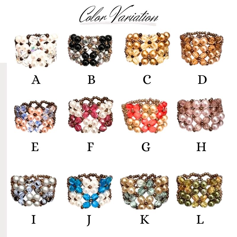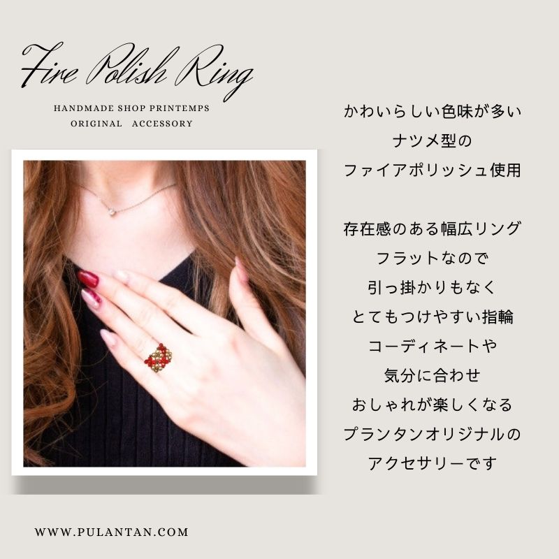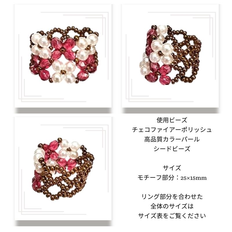 チェコビーズを使用し製作した4枚花を2段に並べた幅広リング。フラットなので付け心地もよく引っ掛かりもありません。