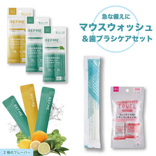 セット内容:・歯みがき粉つき歯ブラシ 1本 ・マウスフォッシュ(ミント) 5本入2パック ・マウスフォッシュ(シトラス) 5本1パック ・圧縮タオル 8個1パック