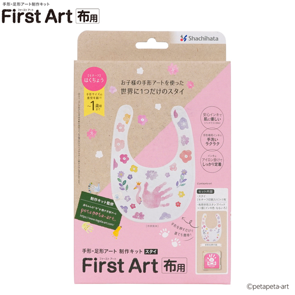 <セット内容>スタイ(モチーフ印刷入り)×1枚、布用手形スタンプパッド×1個(インキ色:ももいろ)