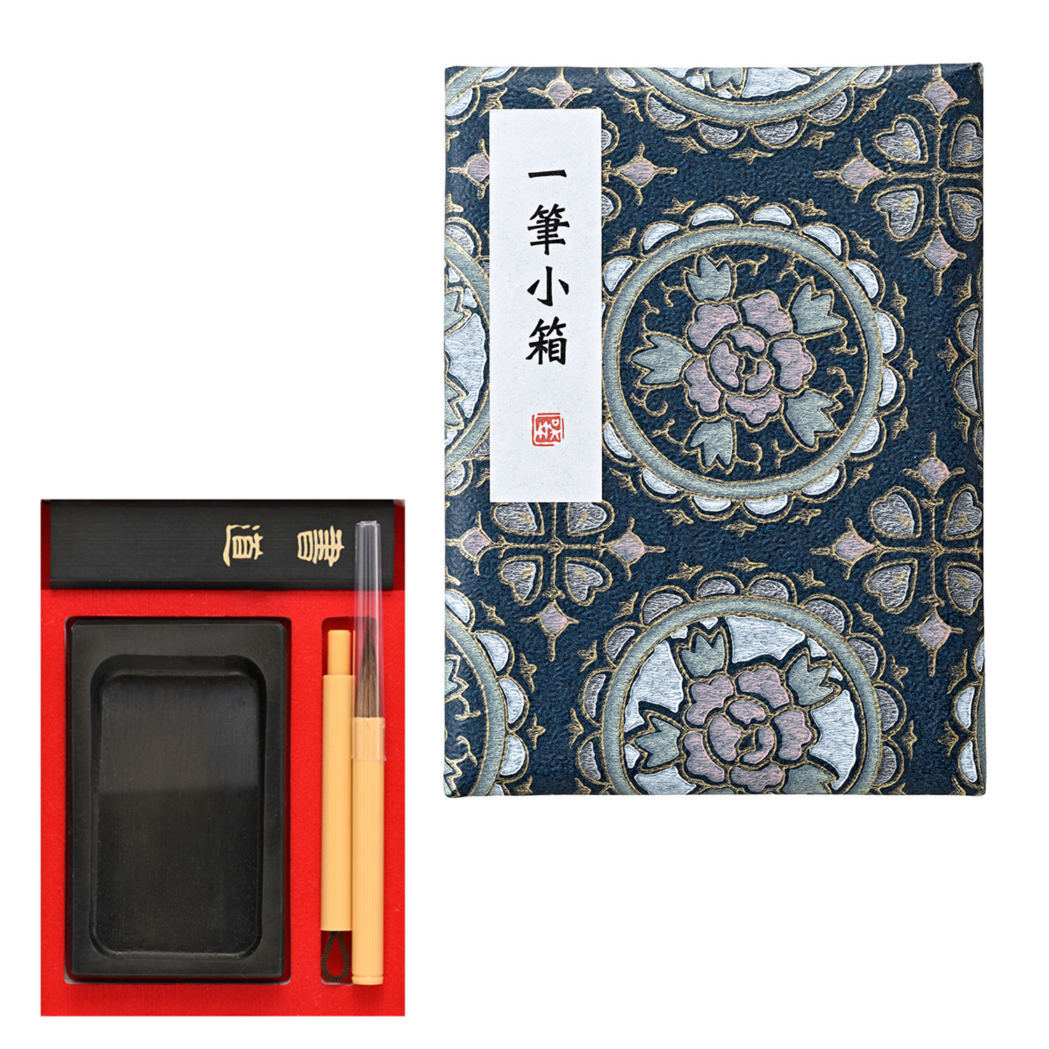 小さくてかわいい紙箱に小筆、墨、硯をセットしました。