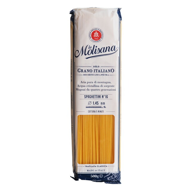 ラ・モリサーナ社は、イタリア全土のパスタメーカーの中でも5本の指に入る販売シェアを誇る1912年創業の老舗パスタメーカーです。 モリーゼの高地に豊かに湧く、ヨーロッパ有数の清らかな水と高品質なデュラム小麦のセモリナを使用し、ラ・モリサーナ社のパスタは作られています。 さっと茹で上がる極細のロングパスタ。“スパゲッティーニ”と呼ばれる少し細めのスパゲッティ。ソースを問わず、幅広くご使用いただけます。 |