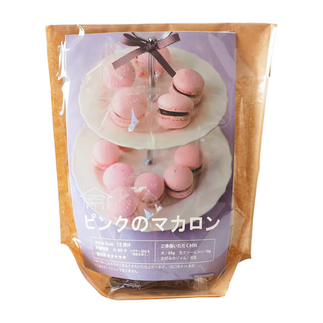 ■キットに入っているもの ラピッドマカロン 50g アーモンドパウダー 50g 粉糖 50g ビーツパウダー 2g <不二製油>クーベルチュール ノワール55フレーク(スイートチョコレート) 30g 絞り袋 2枚 ガイドシート 1枚 [ラッピング] 溶断TT(のり付パックNo.1) 15枚 マカロン丸白(ラッピングシール) 15枚