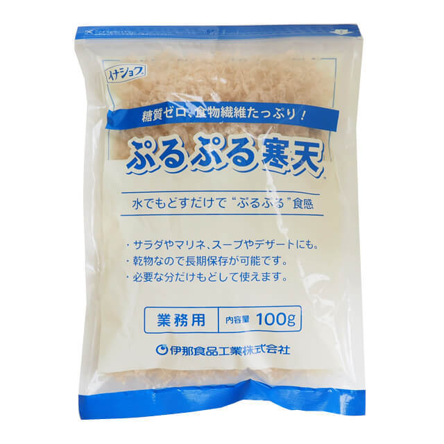 「寒天」と「こんにゃく粉」からできたぷるぷる寒天は、水で戻すだけでぷるぷる食感! 糖質ゼロで、不足しがちな食物繊維を手軽に補給することができます。必要な分だけもどして、サラダやマリネ、スープやデザートなどにご使用ください。乾物なので長期保存が可能です。 |