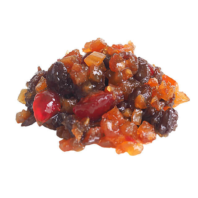 オレンジピール、レーズン、チェリー、アップル、パインを、砂糖、ラム酒、水飴、ブランデーで漬け込んでいます。