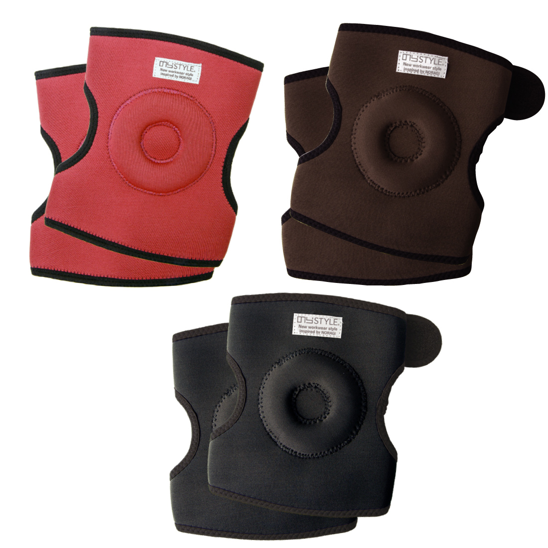 ヒザをついた時の負担を軽減するクッション性と、曲げた時の違和感を減らすためにドーナツ型のクッションを採用。左右両用です。