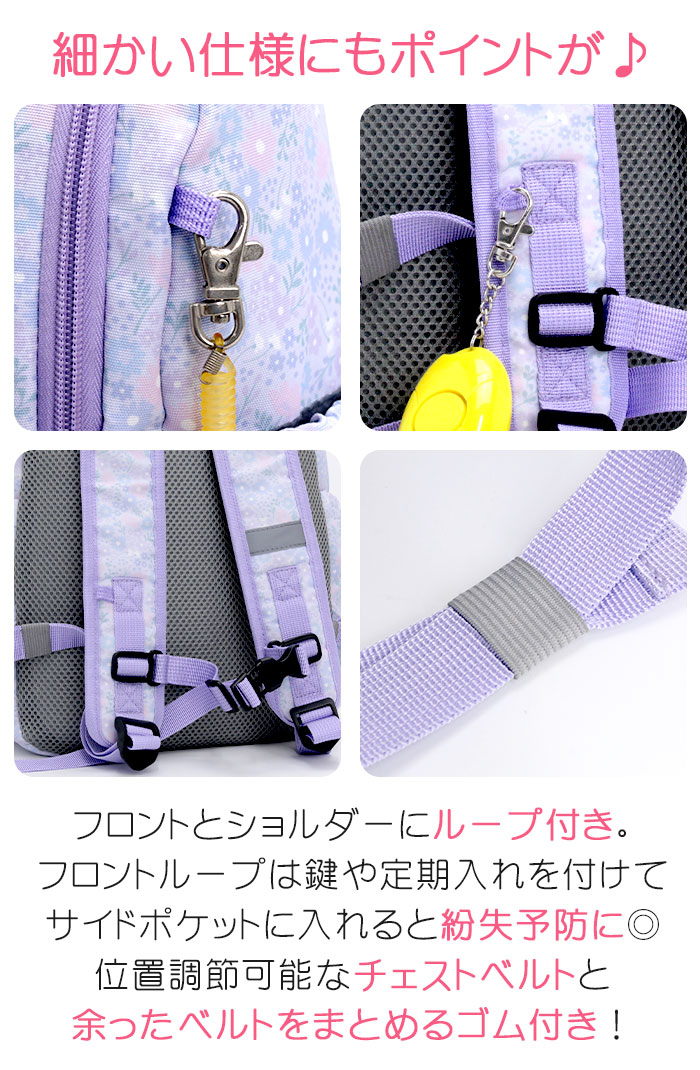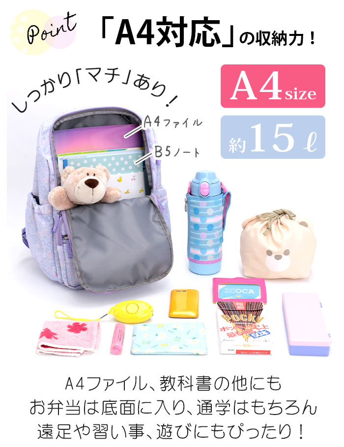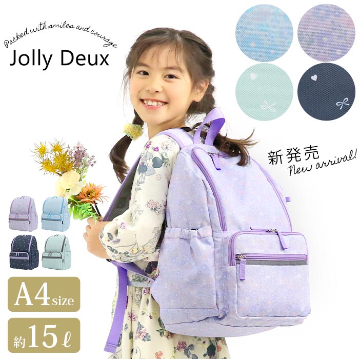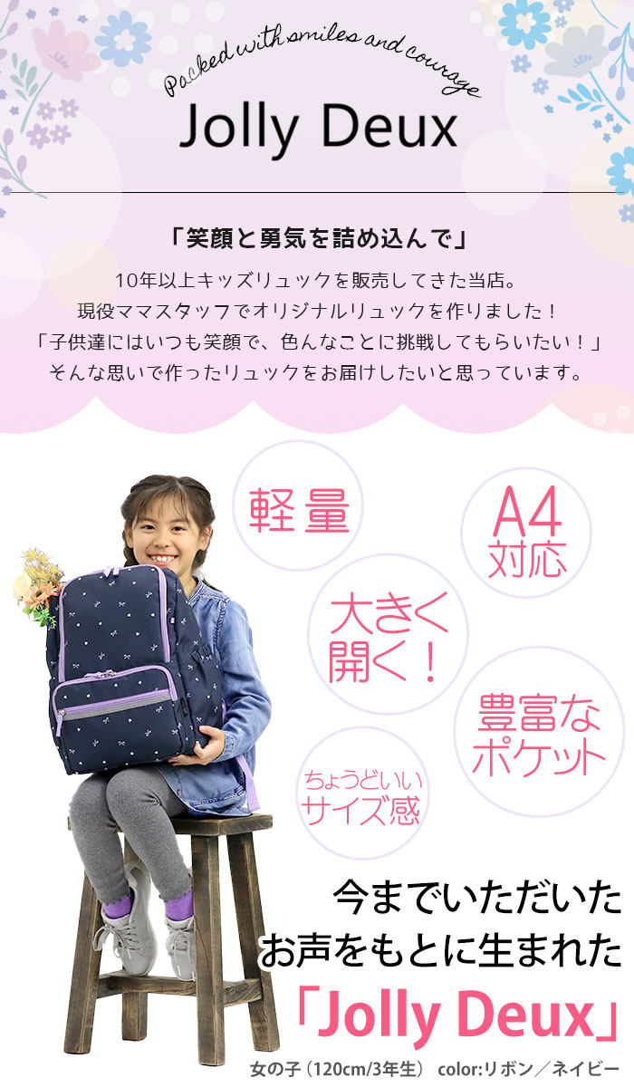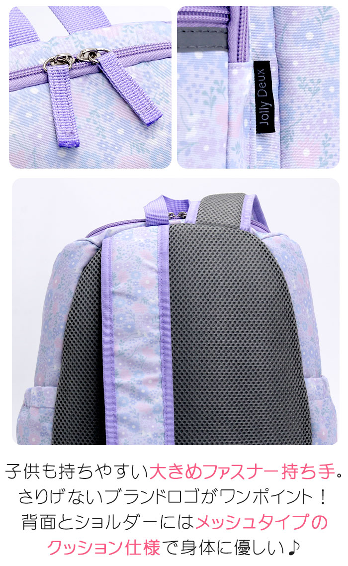 | 10年以上キッズリュックを販売してきた当店。今までのお客様のお声を生かし、現役ママスタッフでオリジナルリュックを制作しました! 少し大人っぽくてかわいい柄のキッズリュック「Jolly Deux」★ 子供たちの使いやすさとママの思いを詰め込みました♪ 大きすぎず小さすぎない!キッズサイズとジュニアサイズの間、成長の早い年中から小学校高学年まで使えるサイズ感です! メインルームは、A4ファイルや800mlの水筒、お弁当やレジャーシートも十分入る大きさです!学童や習い事、通園や通学、遠足やお出かけなど様々なシーンで大活躍してくれます! メインルームはガバッと大きく開くので、お子様自身で荷物を出し入れしやすく整理できるよう、中の荷物も見つけやすい設計♪ ファスナー持ち手は持ちやすく大きめに。 ショルダーには元気に動き回るお子様のリュックのずり落ちを防止するハーネスつき!高さや長さを調節できるため、より体にフィットさせて使うことができます。 また、ショルダーにはスライド式のゴム付きで、余ったストラップエンドもすっきりまとめられるので、小さなお子様から高学年まで使用可能。 さらに、光を跳ね返す反射板もフロントポケットとショルダーに付けており暗い夜道も安心です♪ フロントにファスナーポケット2個、サイドポケットも両側に配置。インナーにも大きめのスリーブポケットを搭載しました。 背面は通気性の良いメッシュ素材&クッションパッド入り!汗によるムレを軽減し、たくさん遊んで走っても快適な使い心地! 素材も丈夫で軽く水に強いポリエステルを使用しているため、長くお使い頂けます。なるべくキッズに負担のないよう幅広のショルダーで、軽量に仕上げました。 柄は社内のママスタッフを中心に女性スタッフで考え、高学年でも使えるように少し大人っぽく、子供たちも嬉しくなるような可愛さ、いろいろな服に合わせやすく等、色々な意見をまとめ考案しました♪ デイリー使いから遠足、学童等、たくさんのシーンで使用できるサイズ感とデザインで、プレゼントにも喜ばれること間違いなしです! |