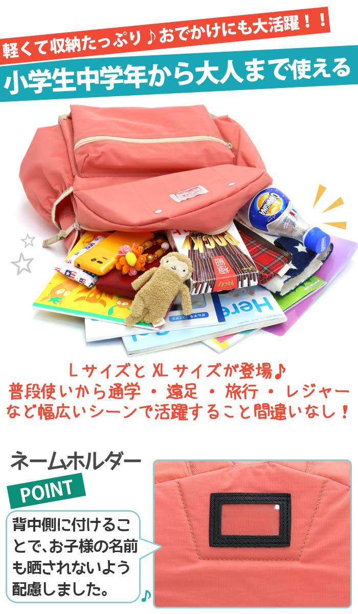 | 新しく生まれ変わった定番デイパック、機能もデザインもさらにアップデート! サイズ展開が拡充され、Lサイズ(約16L)とXLサイズ(約22L)が登場。成長やシーンに合わせて選べるようになりました。小学校の高学年から、大人まで幅広い年代の方にお使い頂けます。 新しいカラー展開と配色で、持ち手や肩紐テープの品質を向上し、腕が抜けにくく、より丈夫で安心して使える仕様になりました。 お子様が開閉しやすいファスナーを使用。 広いマチに全面とサイドにもポケットが2つありペットボトルもすっぽり入ります。 背中側にネームホルダーを付けることで、お子様の名前も晒されないよう安全に配慮しました。 内側にはウレタン素材のポケット付きで、ファイルやタブレットなど、荷物整理にうれしいポイント。 肩紐テープをまとめれるゴムタブ付きなので、余ったストラップエンドの悩みも解消!お子様もさらに快適に使えます。 ショルダーベルトと背面はクッション入りで肩への負担を軽減。さらに、位置調節が可能なハーネスベルトがズレを防いで体にフィットし、長時間の使用でも疲れにくい◎ お子様の使いやすさにこだわったベーシックなリュックサックは、普段使いから旅行・レジャーなど様々なシーンでお使い頂けます。 2〜3歳向けXSサイズ、年少〜年中向けSサイズ 、年長〜小学低学年向けMサイズもあるので、兄妹姉妹でお揃いコーデも可愛い♪ プレゼントにもオススメです! |