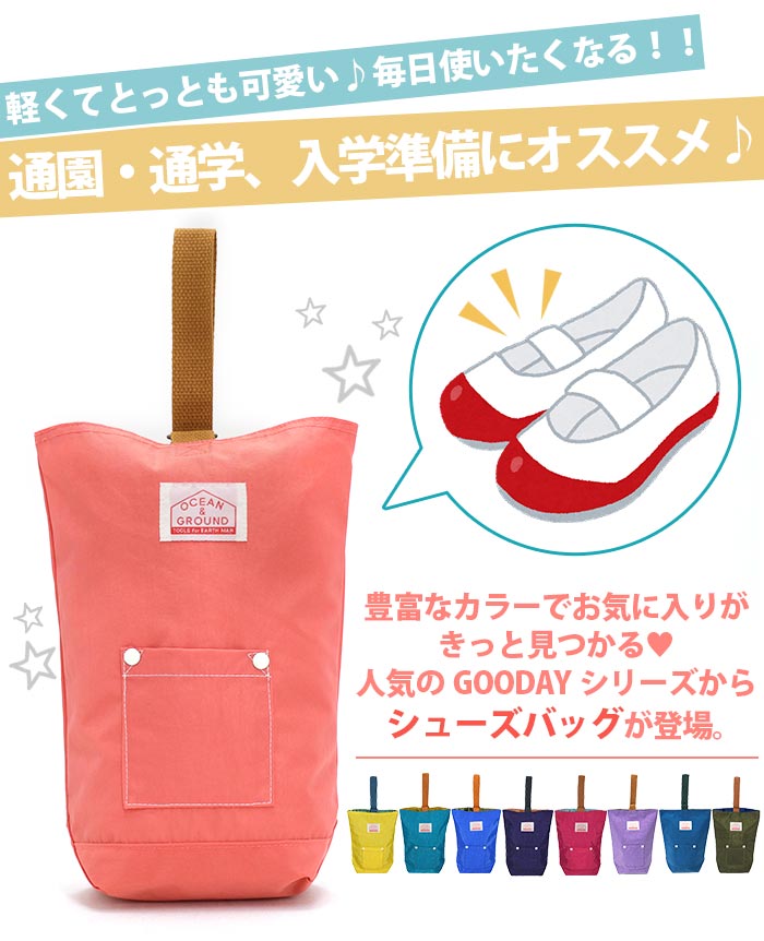 | カラフルなカラー展開でお気に入りがきっと見つかる♪ 人気のGOODAYシリーズから、通園・通学にぴったりのシューズバッグが登場。 中と外と、それぞれ配色を変えているデザインが可愛いのもポイント! 軽いのでお子様が持っても負担がかかりにくく、しっかりとした生地で長くお使い頂けます。 名前入れが付いて実用性もバッチリ◎入園、入学のご準備にオススメです。 プレゼントやお祝いにも喜ばれるシューズケースです。 |