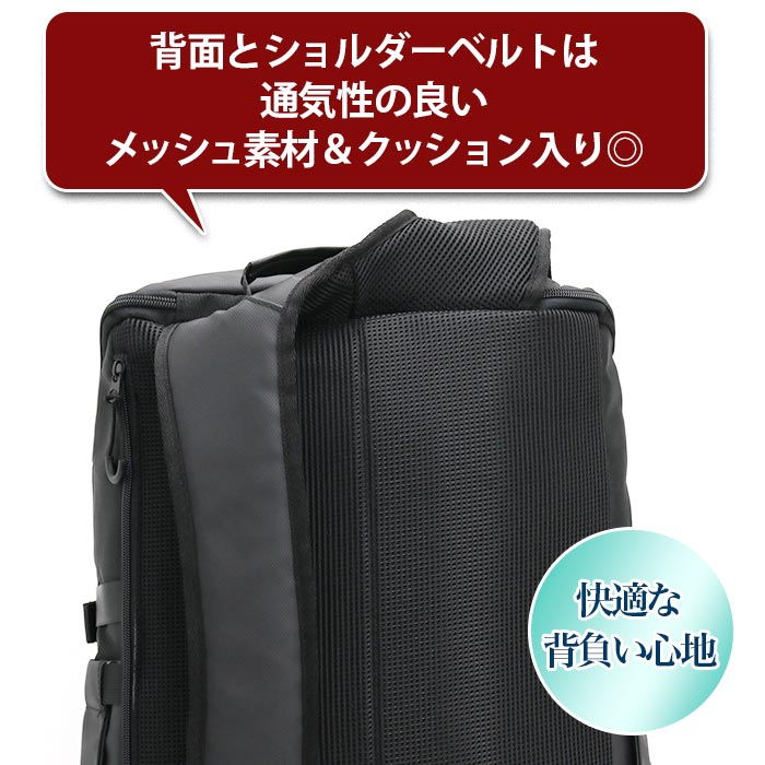 背面とショルダーベルトは、クッションパッド入り&通気性の良いメッシュ素材を採用。