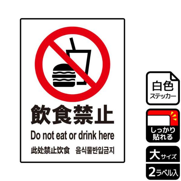 飲食をご遠慮いただきたい場所に最適な禁止標識サインステッカー。※ご注意※特に直射日光や風雨等にさらされる場所では、長期にわたるご使用により印刷部が退色したりステッカーが変色する可能性がありますので、定期的な取替をおすすめします。強粘着糊を使用していますので、はがす際に被着体を傷めるおそれがあります。被着体によっては接着しにくい場合があります(皮革・複雑な曲面・凹凸面など)。