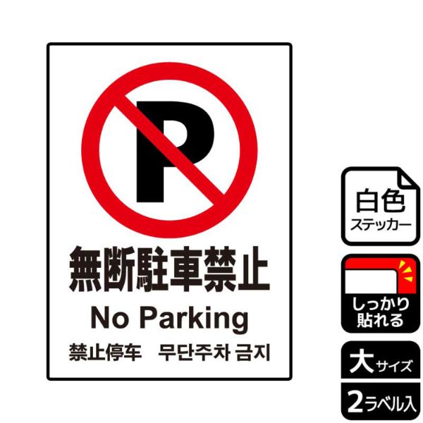 迷惑駐車の防止や出入口など、駐車はご遠慮いただきたい場所に使える禁止標識サインステッカー。※ご注意※特に直射日光や風雨等にさらされる場所では、長期にわたるご使用により印刷部が退色したりステッカーが変色する可能性がありますので、定期的な取替をおすすめします。強粘着糊を使用していますので、はがす際に被着体を傷めるおそれがあります。被着体によっては接着しにくい場合があります(皮革・複雑な曲面・凹凸面など)。