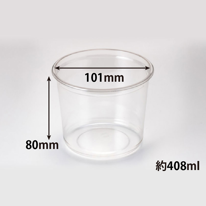 従来のクリーンカップにバイオPETを一部混合させた植物由来の汎用透明丸カップ。
