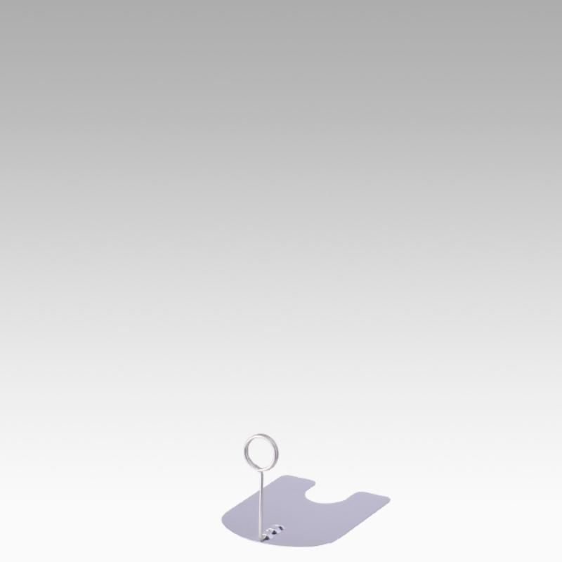 先端のリングにポップカードを挟んで掲示するポップスタンドです。プライスカードが隠れ過ぎない大きさのリングで、カードがしっかり挟めます。素材はサビに強いオールステンレスになっております。カフェやベーカリーなどの飲食店では絶大な指示を得ています。 。[ベースサイズ]70×85、[本体高さ]60mm、[リング部分内径]約2cm