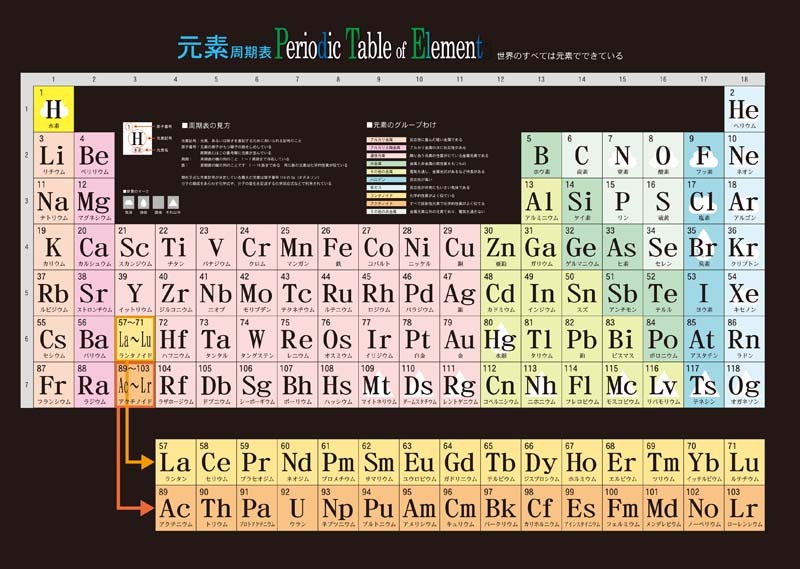 □ A2サイズ 594×420 mm フルカラー版ポスター 元素周期表Periodic Table of Element 元素周期表世界のすべては元素でできていますカラフルな構成でむつかしい元素一覧表をわかりやすく記載してありますアルカリ金属、アルカリ土類金属、遷移元素、版金属、ハロゲン、希ガス、ランタノイド、アクチノイド、その他の非金属それぞれ色分けされています 気体、液体、個体の区別アイコンでわかりやすくなっています解説文は、小学生、中学生、高校生を対象としてわかりやす