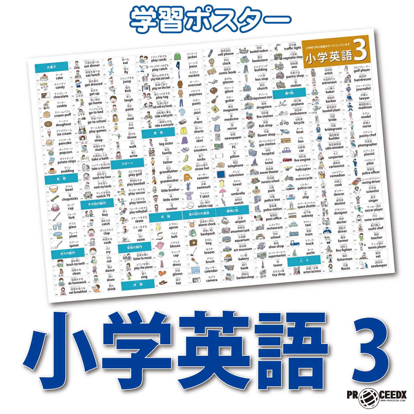 0958小学英語3□ A2(420× 594mm) フルカラー版ポスター小学校でまなぶ英単語がすべて入っていますお子さまにとって覚えやすくて役に立つ、身近な単語が習得できます。食べもの、自然、学校にあるものなど、お子さまにとって身近なジャンルから出題されますイラストで英語を覚えるので 楽しくどんどん覚えれます書店で販売していないプロシードだけのオリジナル商品です小学英語3の内容お菓子、食器、日々の動作、その他の動作、スポーツ、音楽、休息、家族、衣服、身の回り品、建物、乗り物、人々