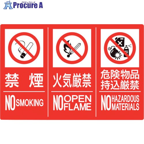 【送料都度見積】●表示内容:禁煙 NO SMOKING 火気厳禁 NO OPEN FLAME 危険物品 持込厳禁 NO HAZARDOUS MATERIALS●取付仕様:ビス止め、両面テープ固定●縦(mm):450●横(mm):300●厚さ(mm):1.2●穴径(mmφ):2.5