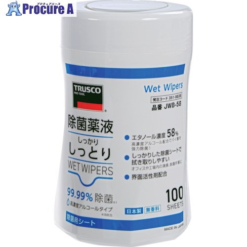 TRUSCO 除菌薬液しっかりしっとりウェットワイパー ボトル 高濃度アルコールタイプ 100枚入 ▼351-9838 JWB-58 1個