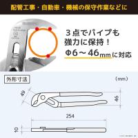 ●全長(mm):254●最大口開き(mm):46●調整(段階):5●先端長さ(mm):49●グリップ幅(mm):46