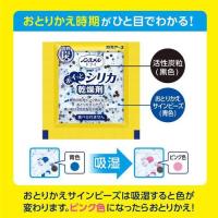 特長:●小さな収納容器に対応したコンパクトな乾燥剤です。●活性炭配合。●湿気を吸うと色が変わるおとりかえサインビーズ入りです。
