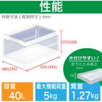 仕様1:●容量(L):43.9●色:透明●外形寸法(mm)間口:530●外形寸法(mm)奥行:366●外形寸法(mm)高さ:272●有効内寸(mm)間口:493●有効内寸(mm)奥行:335●有効内寸(mm)高さ:258●折りたたみ高さ(mm):68●最大積載荷重(kg):5●最高積み重ね段数:5段