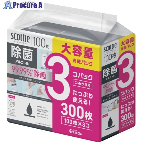 クレシア スコッティ ウェットティシュー除菌 アルコール 100枚 つめかえ用 3コパック ▼697-2532 77137 1パック