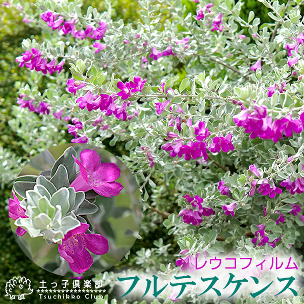 レウコフィルムは、テキサス州〜メキシコを原産地とするゴマノハグサ科の常緑低木です。紫色の花もとても美しいですが、白みがかったシルバーリーフも魅力的です。