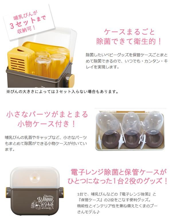 | 説明 | 水を入れて、電子レンジで簡単除菌!!わずか5分で除菌ができて、除菌後はそんまま哺乳瓶の保管ケースとして使用できます。インテリア性を兼ね備えたかわいい「くまのプーさん」モデル |