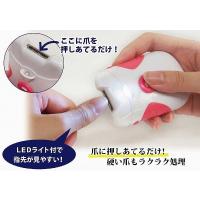 | 説明 | 伸びた爪に押しあてるだけで爪を削ってくれます。厚いツメや硬いつめも、ラクラク処理!カットするのではなく、削るから仕上がりもキレイ!LEDライトが付いているので、爪先を照らして削ることができます。爪切りを使うのが難しい・怖い・・・という方におすすめ!削った爪は容器内に入るから外に飛び散らず掃除もらくらく!刃部は水洗いもできるので衛生的です。旅行や出張にも便利な電池式! |