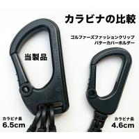 【特長1】大口径のカラビナ。外寸で6.5cm、内寸(最長部)4cm。一般的な3~3.5cmのベルトは余裕で通せます。着脱は片手でワンタッチ。樹脂製でもここまで軸太でしっかりしていると金属製に負けない安心感があります。何より金属を使っていないので、大切なパターを傷つける心配がありません。