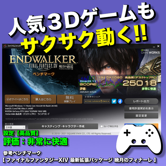 | グラフィック | 【nVIDIA GeForce RTX 5060Ti】 ブーストクロック:2573Mhz メモリ速度:28Gbps メモリ容量:8GB メモリタイプ:GDDR7 バス帯域幅:128bit PCI-EXPRESS:5.0 |