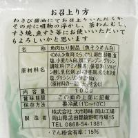 | 原材料 | <めん>魚肉(たら、ぐち)、卵白、砂糖、食塩、小麦たん白、加工デンプン、グリシン、調味料(アミノ酸等)、保存料(ソルビン酸)、乳化剤、pH調整剤<たれ>食塩、グリシン、リン酸塩(Na) |