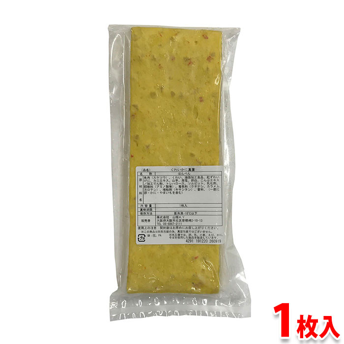 | 原材料名 | 魚肉(スケソウ)、くわい、油脂加工食品、紅ずわいがに、カニエキス、山芋、食塩、卵白、こんぶエキス/加工でん粉、トレハロース、ソルビット、乳化剤、調味料(アミノ酸等)、着色料(クチナシ、カラメル、カロテン)、増粘剤(キサンタン)、香料 |