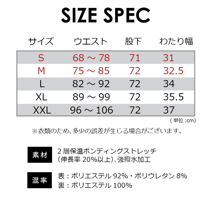 素材/2層保温ボンディングストレッチ(伸長率20%以上)、強撥水加工