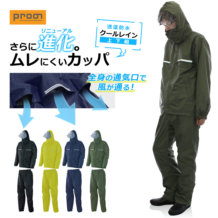 合羽 雨対策 梅雨対策 登山 ハイキング キャンプ ゴルフ アウトドア 釣り 自転車 バイク 通勤 通学 Prono Proの 作業服 作業着 ◆商品紹介◆ 登場以来、ロングヒットしているレインウェア「クールレイン」のリニューアルモデルが登場です!! ◆「クールレイン」のおすすめポイント&改良ポイント! ◇新モデルの改良ポイント! ・ジャケットの首周りを小さくして、ダボ付きを軽減しました! ・ジャケットのフロント部分左右に反射材を追加!暗闇や夜間での視認性がアップ!! ・パンツにポケットがついて、収納力がアップしました! ・股下に通気口を追加し、さらに風が通りムレにくくなりました!! ◇「ベンチレーション」=「通気口」で風が通る!ムレを防ぐ!! 透湿防水素材を使用しているので、そのままでもある程度ムレは感じずらいんですが、クールレインはさらに通気を良くするため、胸や背中、腰や股下に「通気口」を設けています。 ◇他にも、快適に着られる工夫がいっぱい!! ☆生地の内側は総メッシュ! カッパを着たら腕や首に汗でベッタリ張り付いた…なんてことはないでしょうか? 「クールレイン」は総メッシュ!!風を通すサラサラの肌触りです! ☆肩にパッドを入れて、さらに風が通る設計に! 「なんで肩にパッド?」と思うかもしれません。ですが、これがいい仕事をするんです! 上着の重みがかかり、生地が肌に密着しやすい肩に、通気性抜群の薄手のメッシュパッドを内蔵。 メッシュパッドが肩の上にわずかなスキマを作るので、より空気が循環する構造でムレにくくしているんです。 ☆フードのツバを透明に!視界良好! 雨の日は太陽が雲に隠れて薄暗いもの。雨粒を防ぐためにカッパのフードをかぶると、どうしても視野が狭くなります。自転車やオートバイのときは、とても危険な状態ですよね。 クールレインのジャケットは、フードのツバを透明にしました。「フードの前部分がちょっとだけ透明」ではなく、前〜側面まで広い範囲が透明になっています! 顔にかかる雨粒をしっかりガードしながら、視界良好です! 「雨の日に少しでも涼しく過ごしたい」というお客様、一度クールレインを着用してみませんか? 当店のイチオシ看板商品、ぜひ試してみてください! |